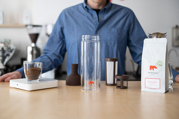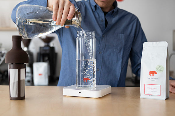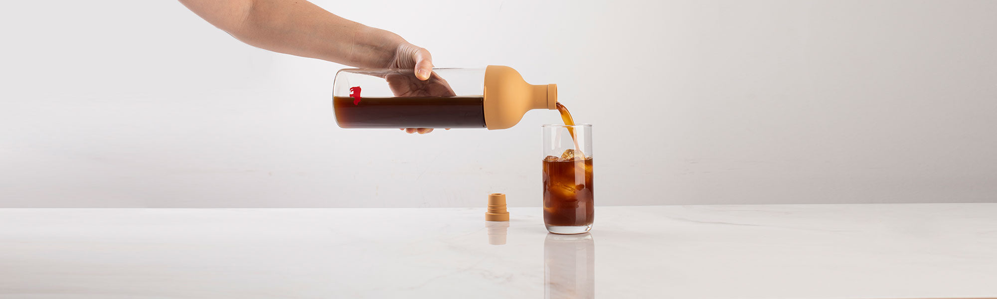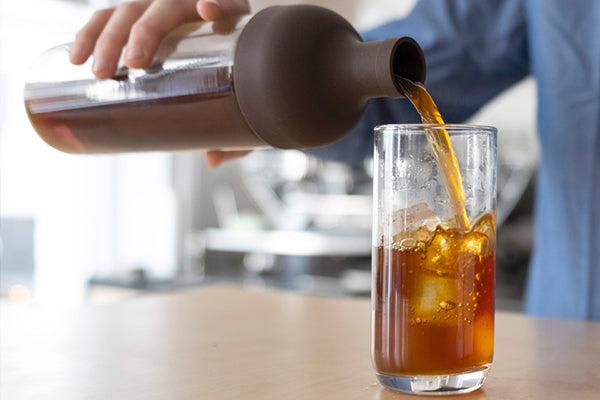 Saturate all the grounds by gently rotating the brewer. Allow to brew for 8-12 hours. Remove the filter, place the top of the bottle back onto the glass base, open the spout, and pour over ice.
