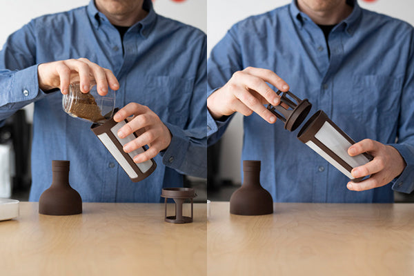 Twist to open the filter, then add coffee to the bottom compartment. Reattach top of filter.